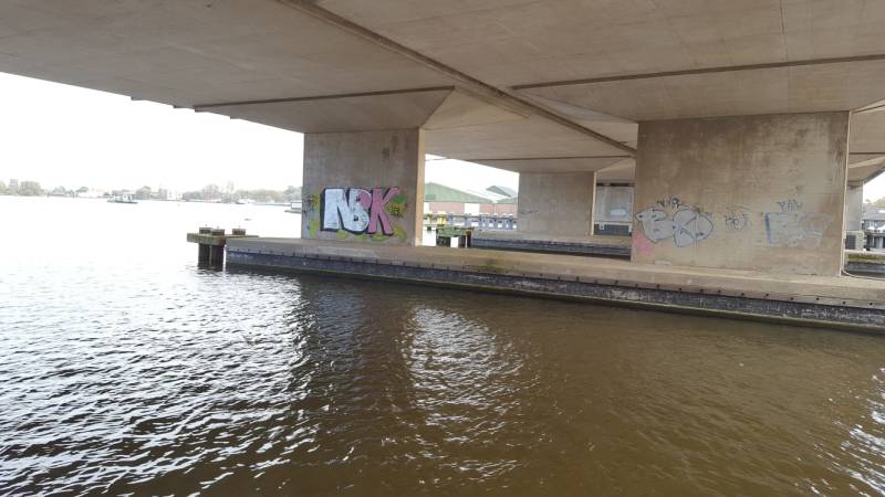 Hiervoor ben ik 10 meter verder gelopen en heb ik mij omgedraaid. De dynamiek zie je in de vorm graffiti, omdat ze speels zijn. In deze reeks foto's heb ik donkere en lichte lichtinval laten zien. De lucht is mooi in beweging (bijv. foto 3) , het water mooi belicht wordt.